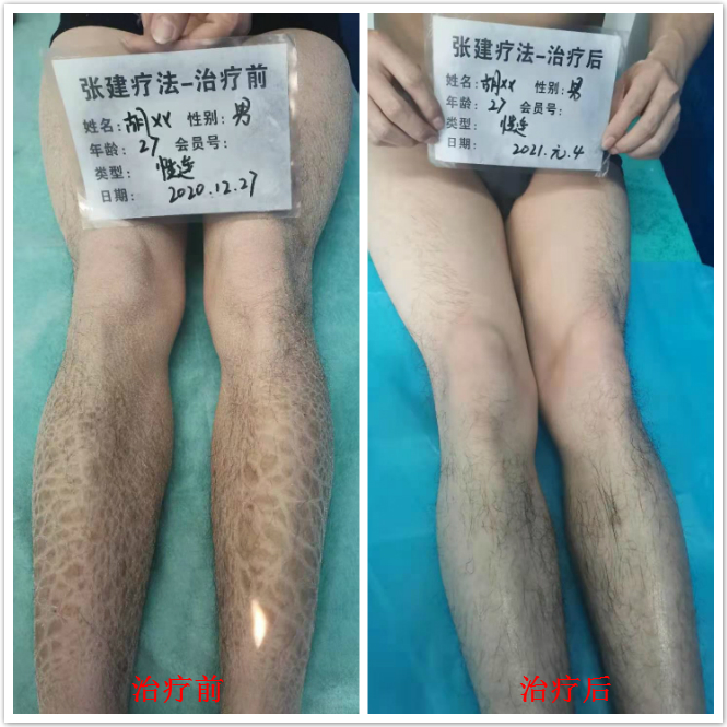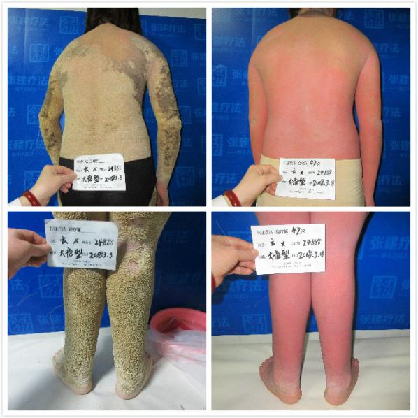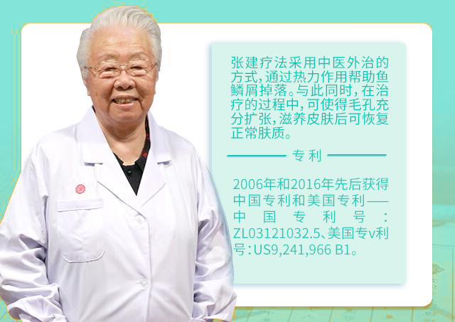 張建療法采用中醫(yī)外治的方式,通過熱力作用幫助魚鱗屑掉落。與此同時(shí),在治療的過程中,可使得毛孔充分?jǐn)U張,滋養(yǎng)皮膚后可恢復(fù)正常膚質(zhì) 在2006年和2016年先后獲得中國(guó)專利和美國(guó)專利 中國(guó)專利號(hào):ZL03121032.5、美國(guó)專利號(hào):US9,241,966 B1。